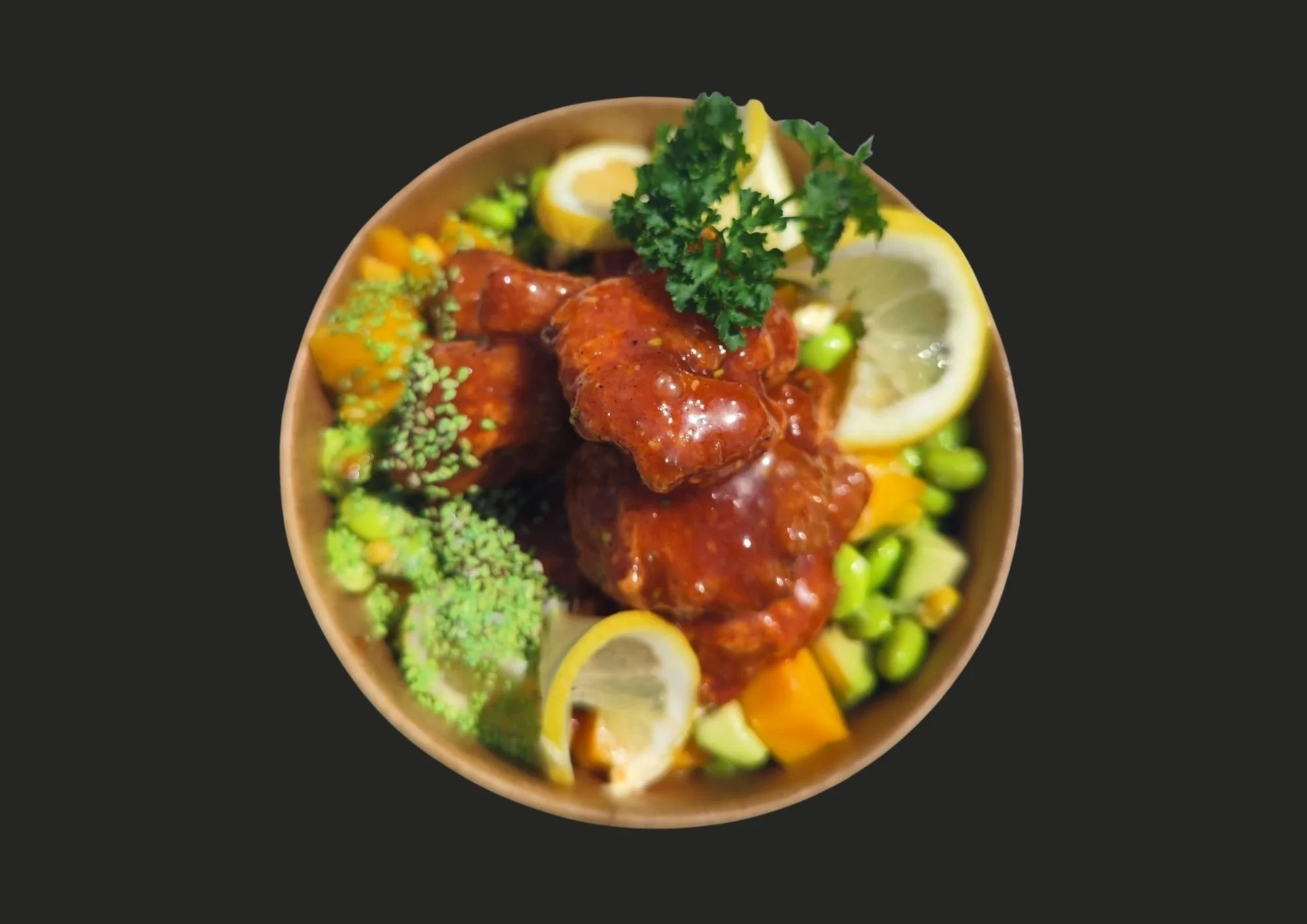Die Bowl Samurai Hot bringt eine feurige Note in dein Menü. Knuspriges Karaage (japanisches frittiertes Poulet) wird in einer aromatischen Korean Sweet & Sour Sauce glasiert und auf lockerem Reis serviert. Dazu knackige Edamame, süsser Mais, Mango und Avocado, die für die perfekte Balance zwischen würzig, süss und frisch sorgen. Ein Geschmackserlebnis mit einem Hauch asiatischer Schärfe.